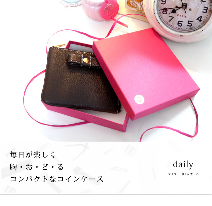 種別 コインケース / 小銭入れ / 財布 サイズ 横11cm 縦9.5cm 厚さ1.2cm (リボンまでの厚さ:2.3cm) 素材 メイン:牛革 内側:豚革(スエード) 重さ 50g 機能 メインポケット×1 コインポケット×1 サイズ・重さは概寸です ギフト対応 ふんわりとやわらかな牛革をたっぷりと使い、愛らしいリボンをつけたdaily(デイリー)コインケースが登場。
