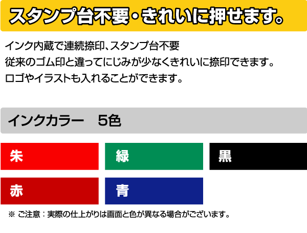 従来のスタンプパッドを使って捺印するゴム印とは違って、 連続捺印が可能できれいに捺印できるのが特徴です。